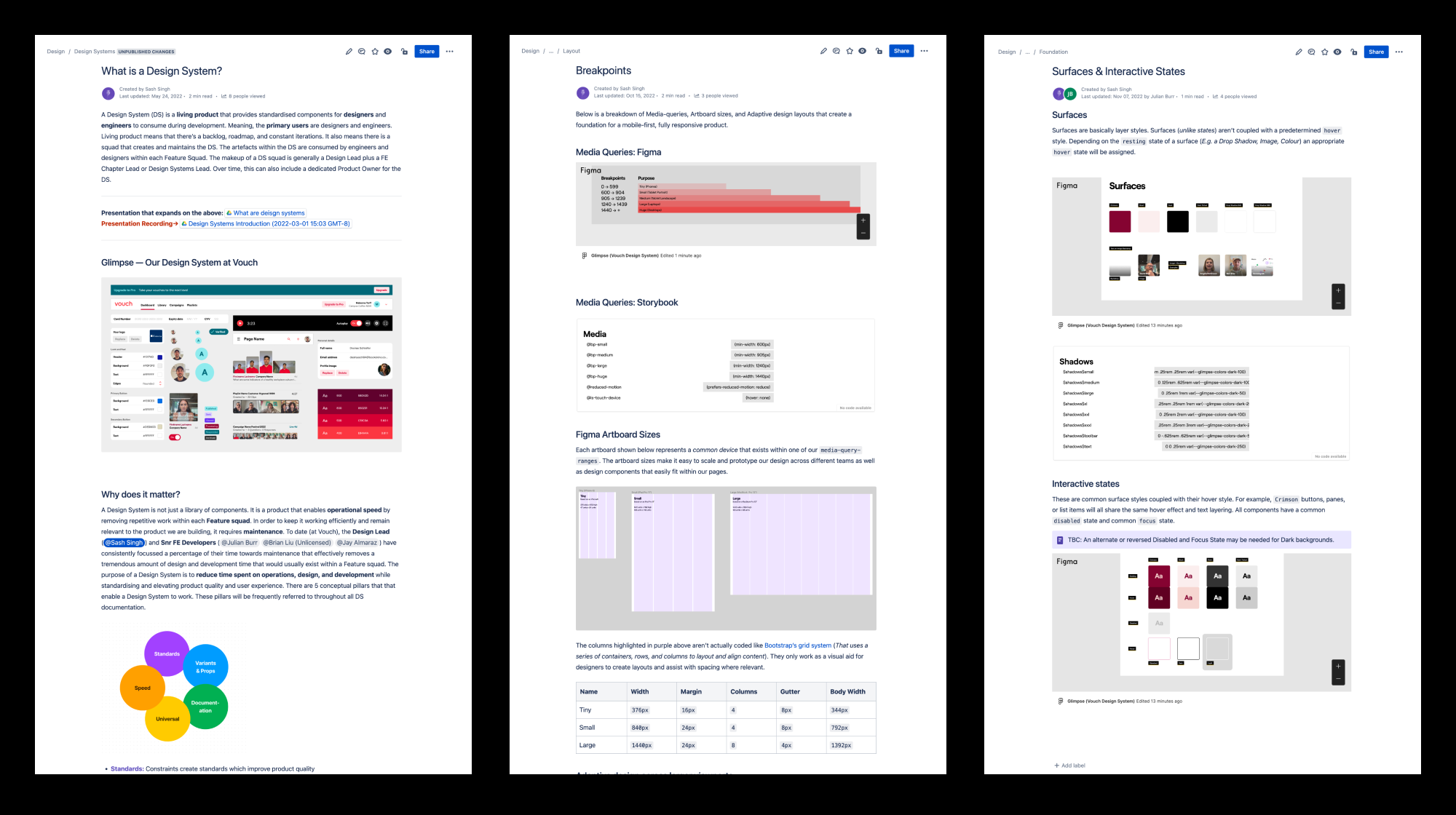 We commonly see components specified in Figma and a developed version stored in Storybook. But documentation (as a Wiki) plays a broader role in adding extra context for how things should be used, what has been learnt, as well as specifics around content-standards for things like PII, internationalisation, and currencies (to name a few).
